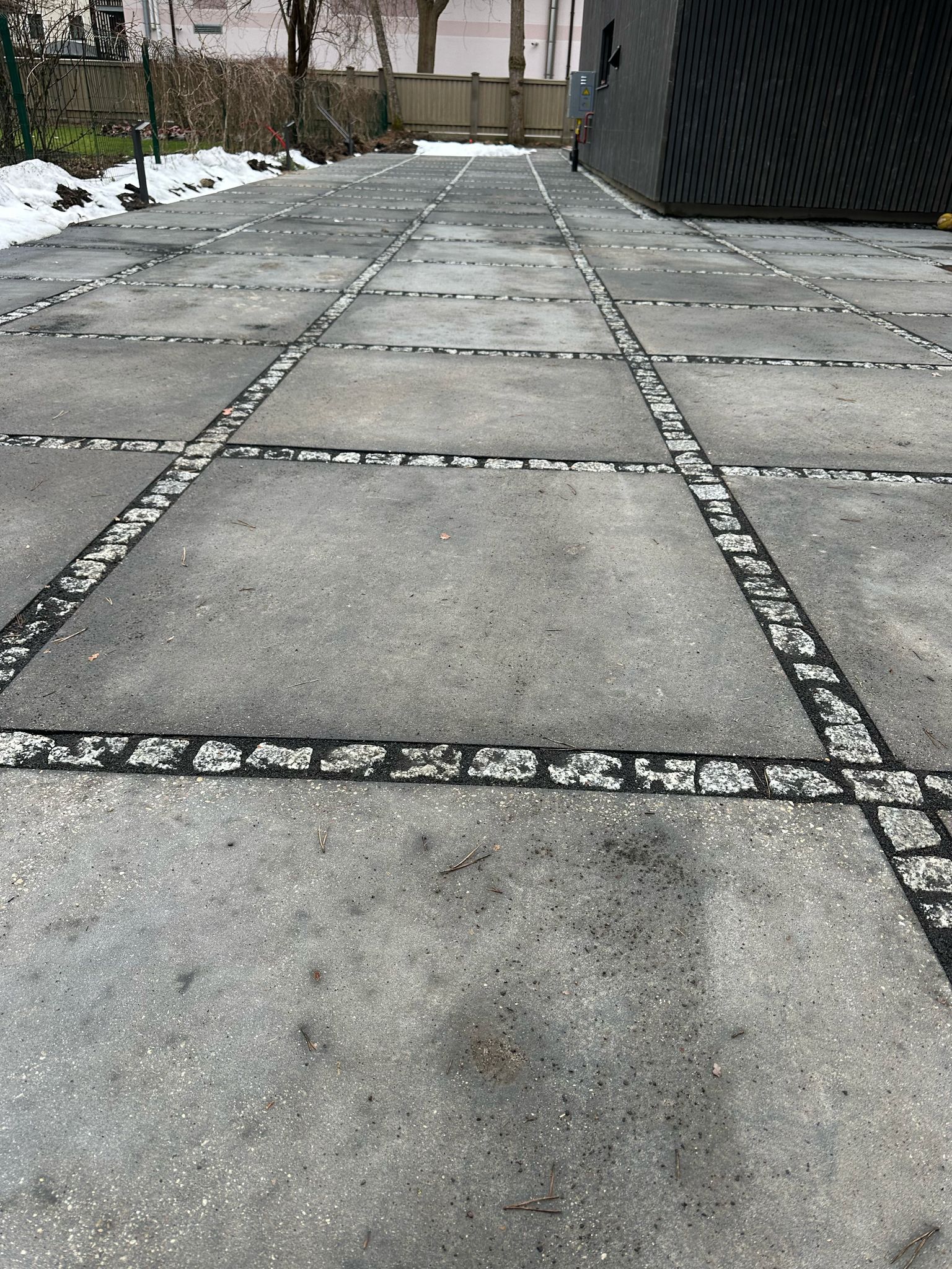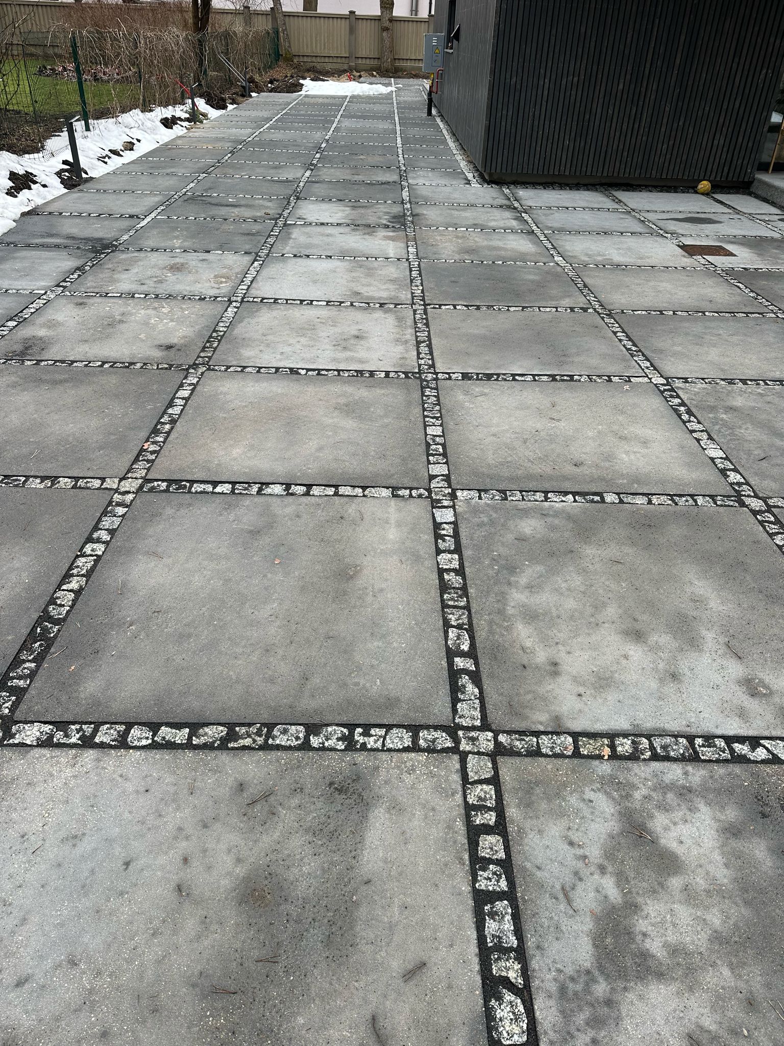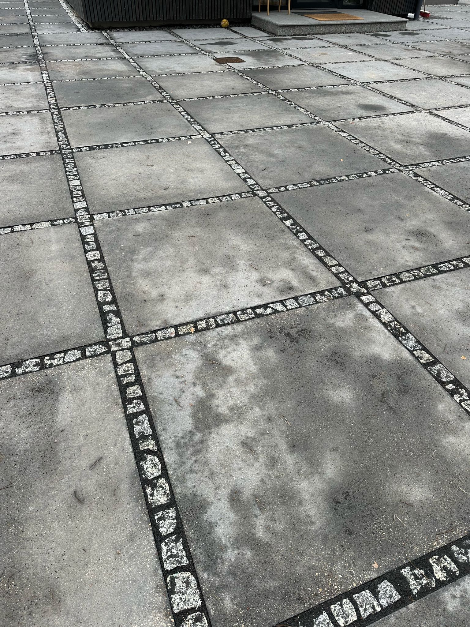 Mežaparka privātmājas teritorijā ieklātas LAT SLABS 1000 x 1000 x 100 mm betona dekor plāksnes, nodrošinot izturīgu un estētisku segumu, kas harmoniski iekļaujas apkārtējā vidē.
